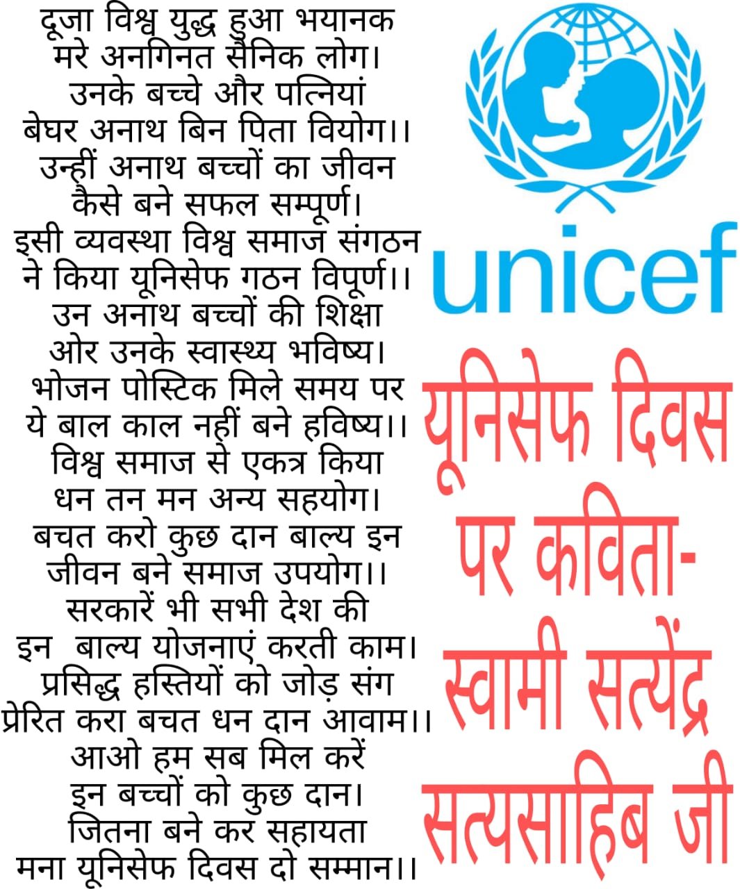 इस यूनिसेफ दिवस पर स्वामी सत्येंद्र सत्यसाहिब जी इस संस्था के बारे ज्ञान बताते हुए आगे अपनी ज्ञान कविता से कहते है कि,