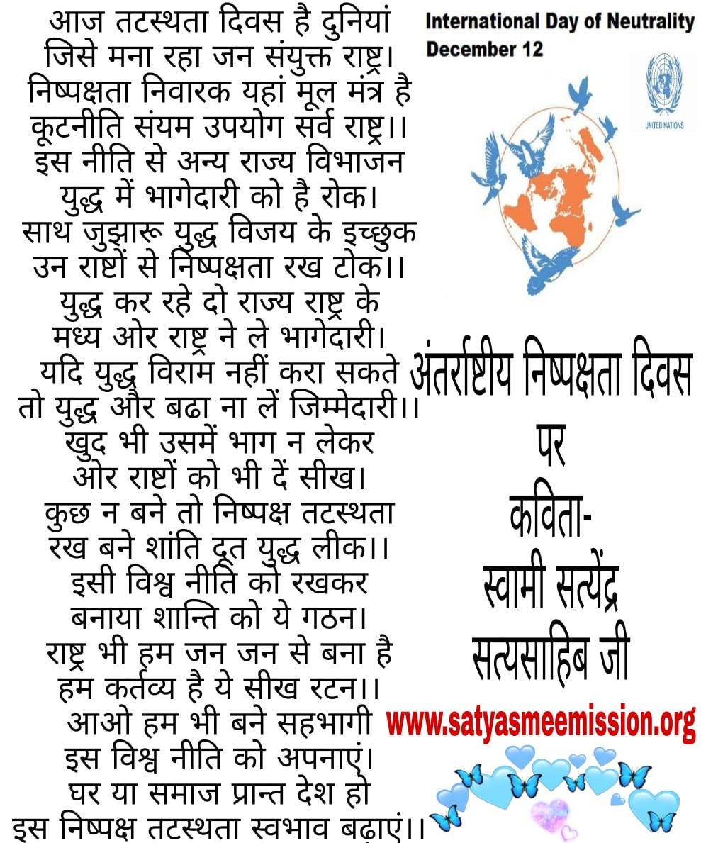कोई भी संप्रभु राज्य यानी सम्पन्न शक्तिशाली उन्नतिशील राज्य या देश जो अन्य राज्यों या देशों के बीच युद्ध में सभी की भागीदारी से रोकता है और जो अपने विकास विस्तार को युद्ध चाहते है।उन जुझारू लोगों के प्रति निष्पक्षता का रवैया रखता है,वो इनके साथ अपने को शामिल नहीं करता है। उसे तटस्थ देश कहा जाता है। हमे भी अपने परिवार समाज प्रान्त देश और विदेश तक को अपने लिए, अपनी ओर इस नीति आदत को अपनाए हुए जुझारू लोगों को इस संयम और निष्पक्षता को पहचानना चाहिए।तभी घर परिवार समाज और देश मे शांति और उन्नति सम्भव होती है,इसी विषय के अनेक पक्षो को दर्शाती स्वामी सत्येंद्र जी की ये कविता इस प्रकार से है कि,